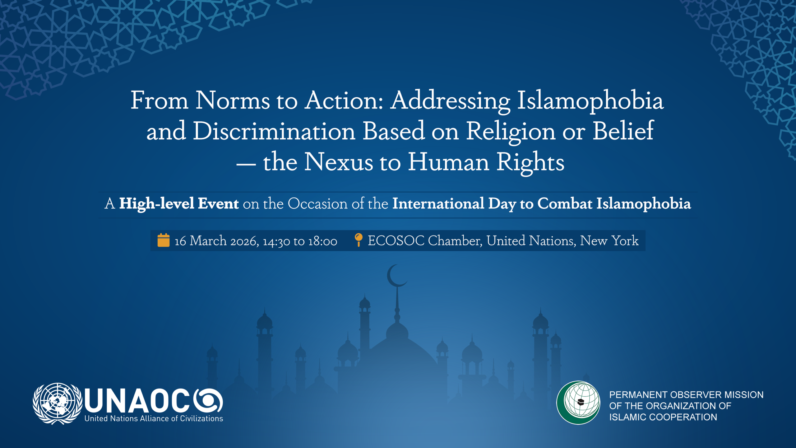 The United Nations Alliance of Civilizations (UNAOC)/Office of the United Nations Special Envoy to Combat Islamophobia, in collaboration with the Organization of Islamic Cooperation (OIC), are convening a high-level event entitled “From Norms to Action: Addressing Islamophobia and Discrimination Based on Religion or Belief – the Nexus to Human Rights.”